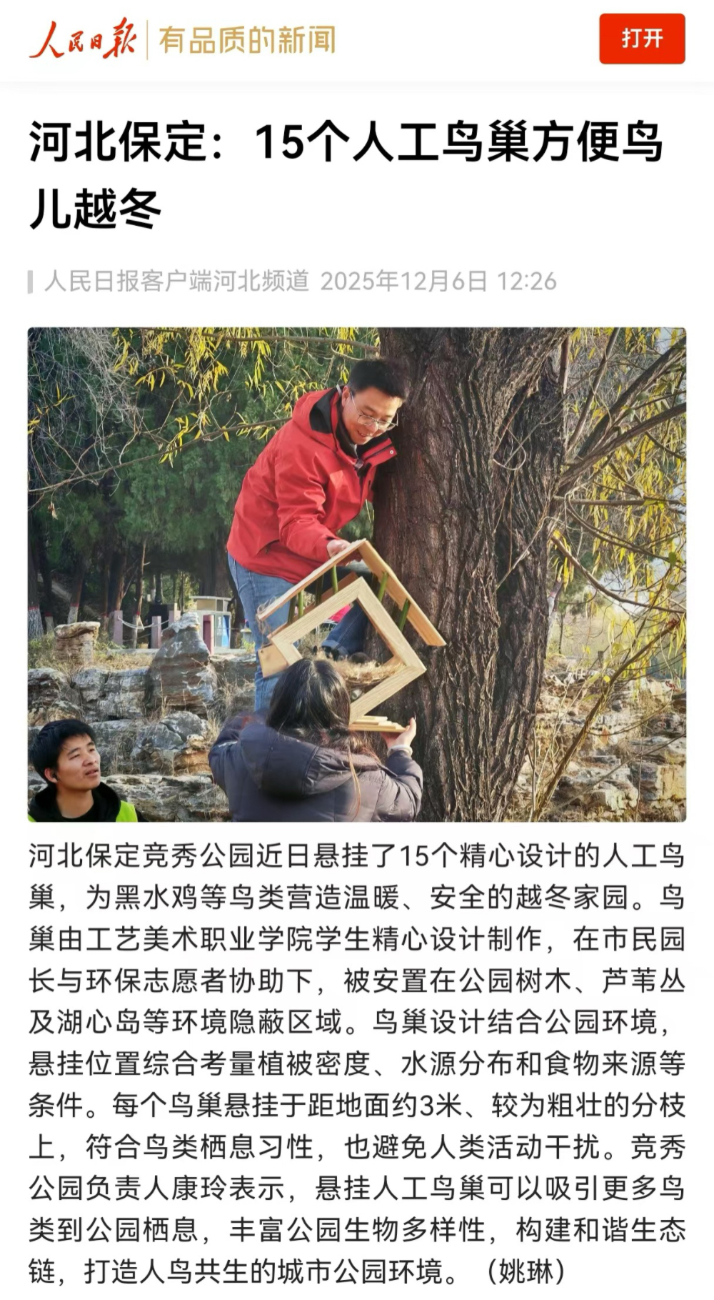 活动中,党员教师牵头组建由设计、手工制作等专业师生构成的志愿服务队。团队通过实地勘察、习性研究和环保材料创新应用,精心设计制作了与自然环境相融的“暖巢”,将生态文明理念落到实处。这既是一次专业的实践锤炼,也是一堂生动的生态文明思政课。