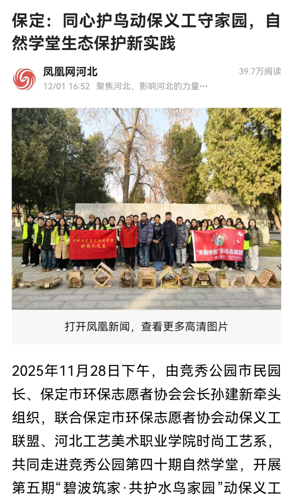 为深入学习贯彻党的二十届四中全会精神,践行习近平生态文明思想,近日,我校时尚工艺系党总支师生一支部联合保定市环保志愿者协会,共同开展“碧波筑家·共护水鸟家园”活动,以专业实践响应“美丽中国”建设号召。