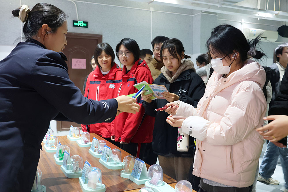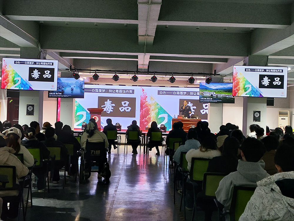 在多功能厅,河北省女子强制隔离戒毒所心理矫治中心主任、一级警长、“闪耀的桔灯”公益宣讲团成员韩洁围绕毒品种类、危害及新型合成毒品的隐蔽性做专题宣讲,并通过发放禁毒知识宣传册、陈列仿真毒品等形式,让同学们直观而深刻地认识到毒品的危害。宣讲结束后,双方就禁毒宣传教育与校所共建机制进行现场交流。