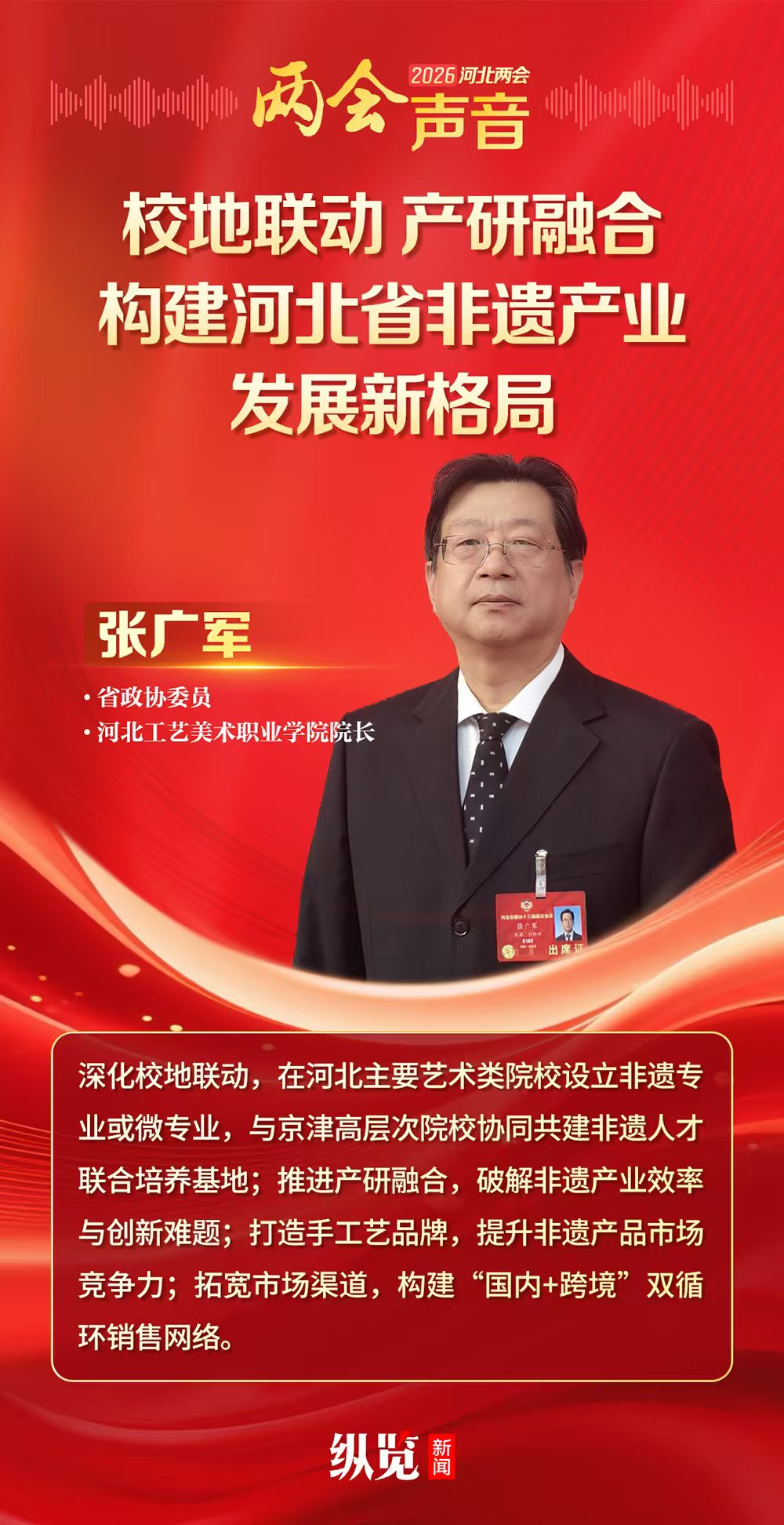 张广军在发言中表示,河北非遗资源丰富、产业基础良好,但在复合型人才培养、产研协同机制、产业差异化发展和市场渠道拓展等方面仍面临瓶颈。他建议以校地联动为纽带、产研融合为引擎,充分发挥高校在人才培养、技术研发、数字赋能和品牌建设中的专业优势,拓宽“国内+跨境”市场渠道,推动非遗资源向产业优势转化,构建河北非遗产业高质量发展新格局。