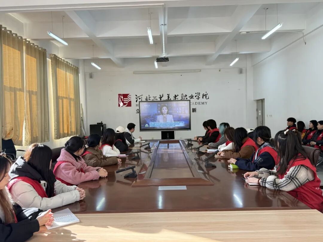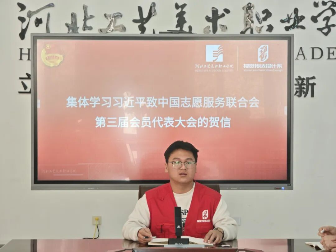 在2025年国际志愿者日来临之际,2025年12月3日,河北工艺美术职业学院视觉传达设计系志愿服务队开展专题学习活动,深入领会习近平总书记致中国志愿服务联合会第三届会员代表大会的贺信精神,凝聚“奉献、友爱、互助、进步”的青春力量,让志愿精神在设计青年心中扎根生长。视觉传达设计系团总支负责人赵骄阳出席学习。系团总支志愿服务部全体成员、系志愿服务队各品牌负责人及志愿者代表参加学习。