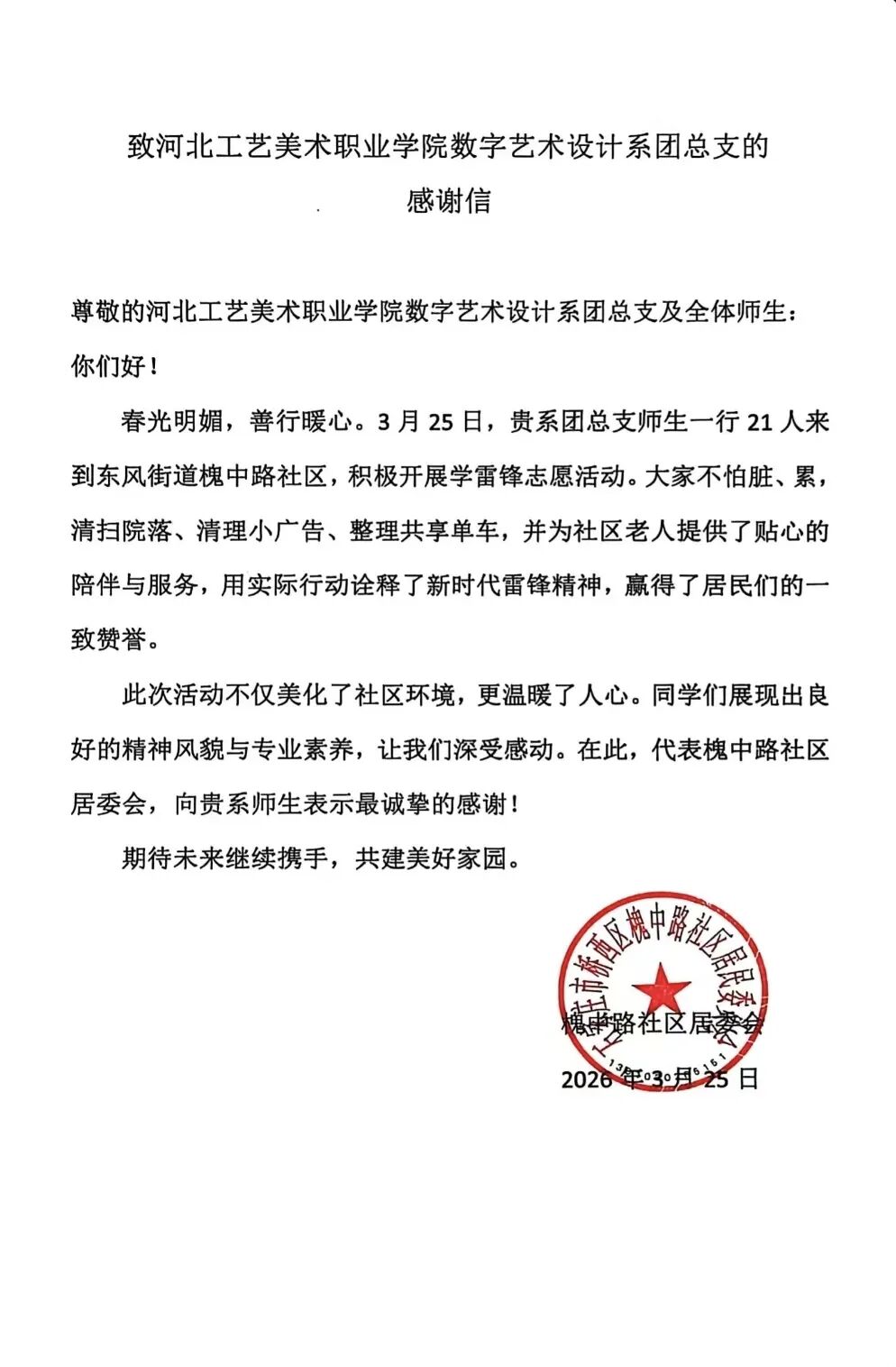 三月春风拂面,志愿温情涌动。为传承和弘扬雷锋精神,践行尊老敬老传统美德,数字艺术设计系组织青年志愿者,走进桥西区东风街道槐中路社区,开展学雷锋主题志愿实践活动,以实干传递温情,以行动诠释初心。