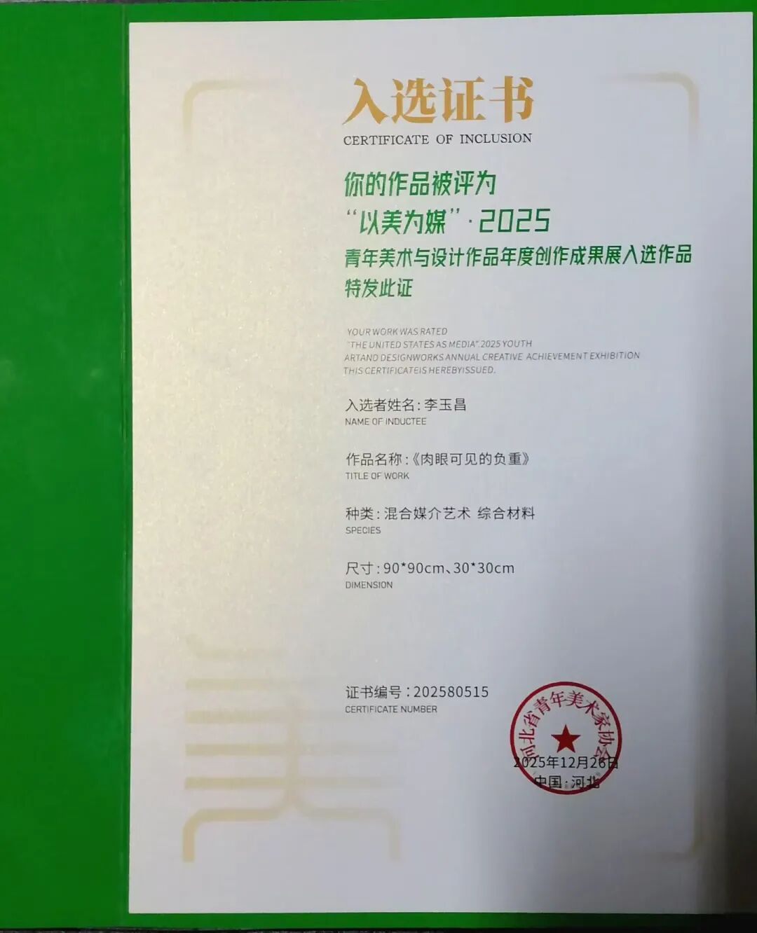 李玉昌同学在艺术创作的道路上步履不停。2025年,他的作品连续入选“宁波架上文化全国写生作品展”“宁波架上文化全国写生研究展”以及“中央美术学院马年生肖复数艺术大展”,展现出扎实的创作功底与多元的艺术探索。2026年初,他的作品,在“‘展其骥足’2026新人新作展”中荣获“优秀作品”称号。这一系列荣誉,既是对他艺术潜力的认可,也见证着他在创作道路上的持续深耕与稳步成长。