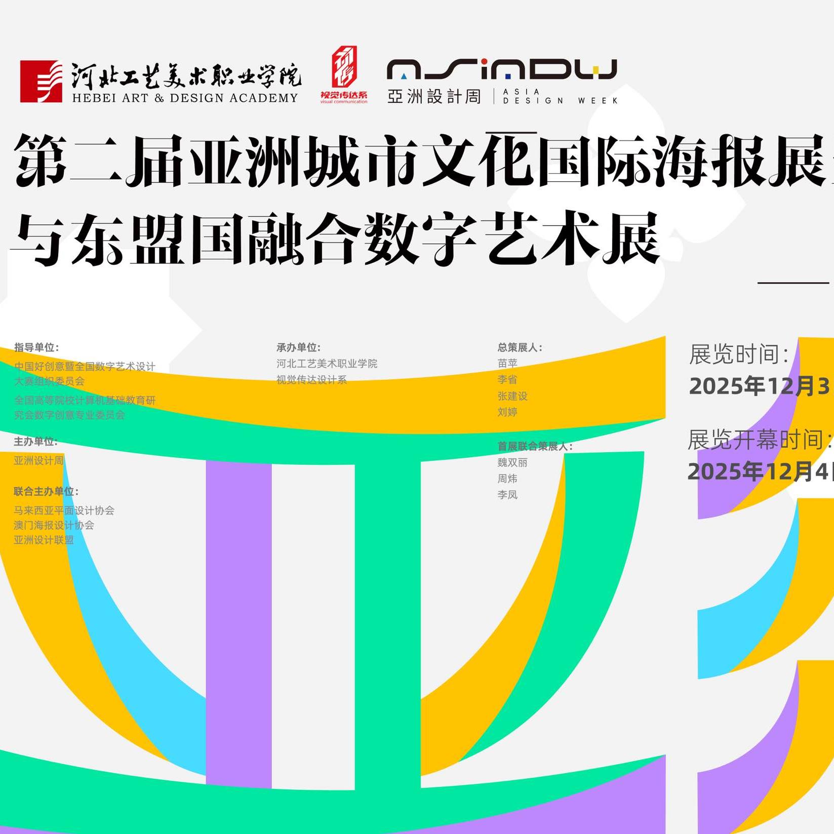 2025年12月4日,由河北工艺美术职业学院视觉传达设计系承办的第二届亚洲城市文化国际海报展暨“一带一路”中国与东盟国融合数字艺术展在鹿泉艺术实践中心开幕。展览由中国好创意暨全国数字艺术设计大赛组织委员会、全国高等院校计算机基础教育研究会数字创意专业委员会作为指导单位,由亚洲设计周主办、马来西亚平面设计协会、澳门海报设计协会、亚洲设计联盟联合主办。
